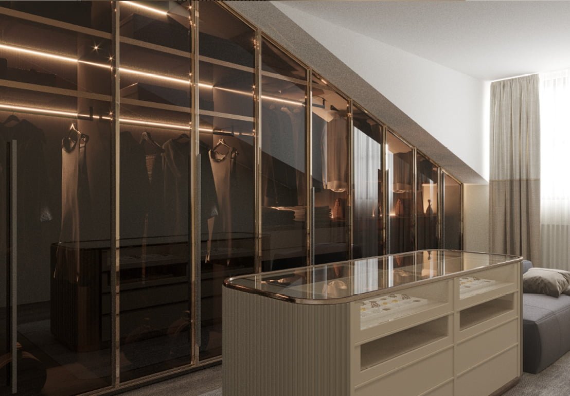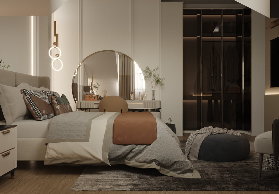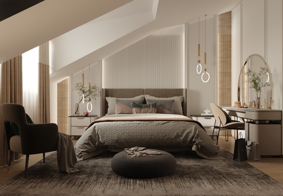 Çatı katında özenle tasarlanan ebeveyn yatak odası, modern estetikle bütünleşir. Tüm alanı efektif şekilde değerlendirerek geniş bir konfor sunuyor.